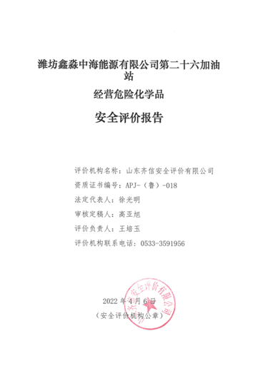 评价组认为:潍坊鑫淼中海能源有限公司第二十六加油站符合安全要求,具备从事汽油、柴油零售经营的条件。