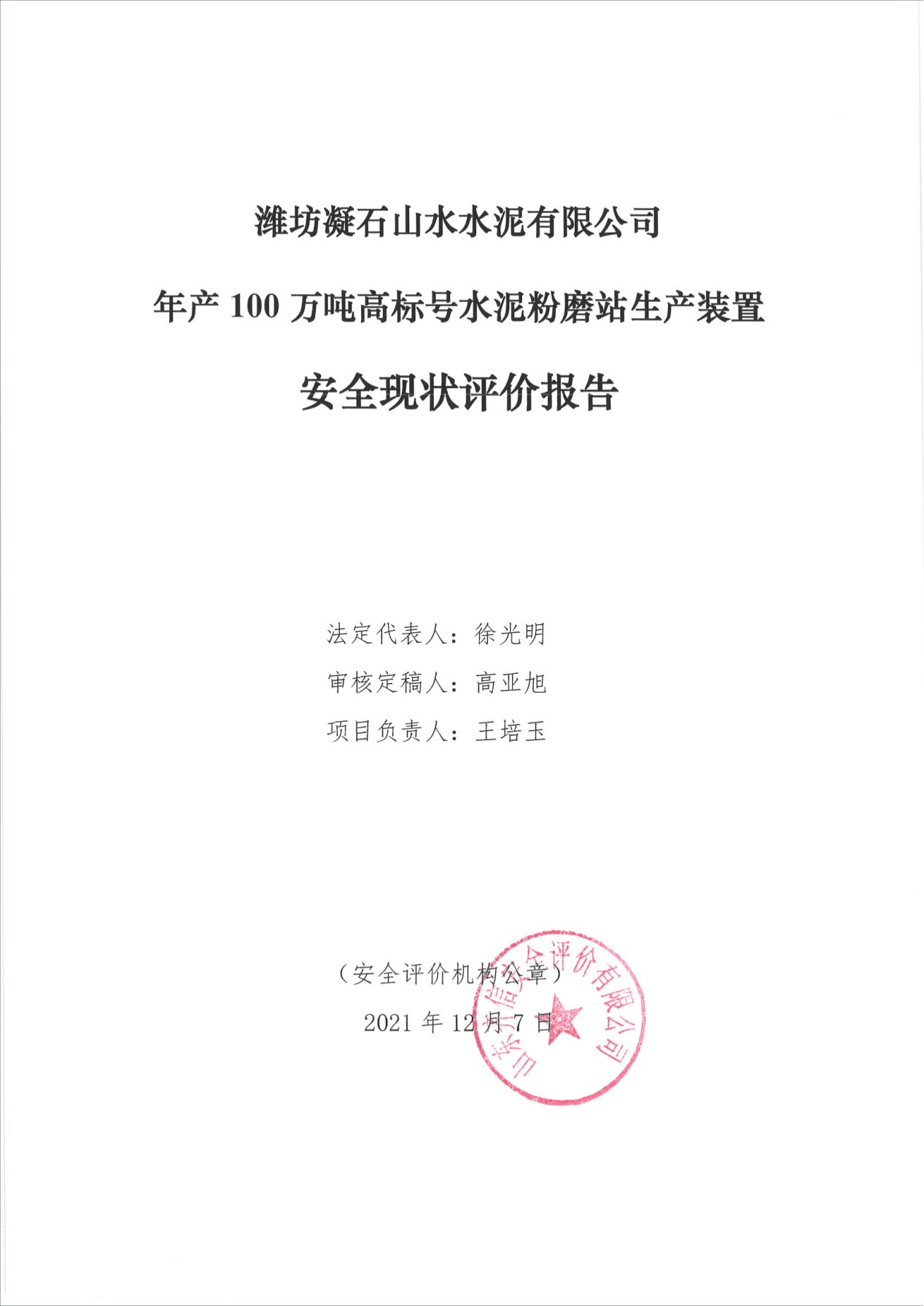 本次评价认为,潍坊凝石山水水泥有限公司应落实报告中提出的安全措施及建议,尽快完善消防验收手续。从目前整体情况看,该企业年产100万吨高标号水泥粉磨站生产装置在消防验收合格后安全状况能够达到可以接受的风险程度。