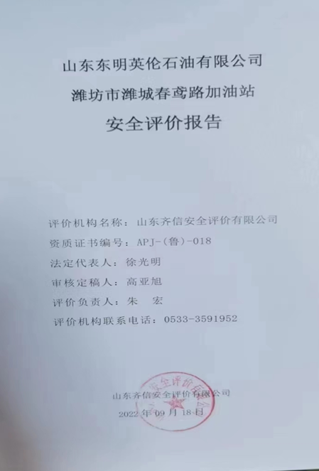 山东东明英伦石油有限公司潍坊市潍城春鸢路加油站位于山东省潍坊市潍城区春鸢路2809号。该站原名为中国石油天然气股份有限公司山东潍坊销售分公司山东潍坊销售分公司第二十三加油站,后由山东东明英伦石油有限公司租赁,成立于2020年1月7日,取得潍坊市潍城区行政审批服务局颁发的营业执照。该加油站主要从事汽油和柴油的经营,经营方式为零售,法定代表人为李开宽。类型为有限责任公司分公司(非自然人投资或控股的法人独资)。 该加油站现有汽油双层罐3个,单罐容积30m3,柴油双层罐2个,单罐容积为30m3,柴油折半计入,该加油站油罐总容积为120m3,根据《汽车加油加气加氢站技术标准》(GB50156-2021)第3.0.9条之规定,为二级加油站。 该加油站由于法定代表人更换,于2022年6月14日更换了危险化学品经营许可证(证书编号:鲁潍危化[2019]002081号),有效期至2023年1月1日;于2022年8月15日换发了成品油零售经营许可证(证书编号:鲁油零售证书第3707133068),有效期至2027年8月15日。 该加油站现有职工6人,其中专职安全管理人员1人,主要负责人和安全员已通过安全生产知识和管理能力考核合格,并取证。 依据《中华人民共和国安全生产法》(中华人民共和国主席令[2002]第70号,根据2021年6月10日中华人民共和国第十三届全国人民代表大会常务委员会第二十九次会议《全国人民代表大会常务委员会关于修改〈中华人民共和国安全生产法〉的决定》修正)、《危险化学品安全管理条例》(国务院令第591号,根据国务院令第645号修订)、《危险化学品经营许可证管理办法》(国家安全生产监督管理总局令第55号,根据安监总局令第79号修订)的要求,危险化学品经营许可证换发需进行安全评价,因此,山东东明英伦石油有限公司潍坊市潍城春鸢路加油站委托山东古天乐太阳集团城入口安全评价有限公司进行经营危险化学品安全评价。 接受委托后,山东古天乐太阳集团城入口安全评价有限公司成立评价组,在进行资料与标准收集、现场调研、项目资料分析、危险与有害因素分析的基础上,依据《安全评价通则》(AQ8001-2007)、《山东省加油站安全评价导则》(鲁安监发〔2006〕114号),通过对该加油站安全管理、站址选择及总平面布置、加油工艺及设施、其他设施等方面的审查,选择相应的评价方法对其危险、有害因素进行辨识和评价,编写完成了《山东东明英伦石油有限公司潍坊市潍城春鸢路加油站安全评价报告》。  |