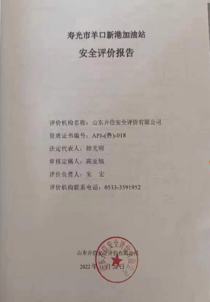 寿光市羊口新港加油站成立于2008年09月04日,注册地位于寿光市羊田路与羊口镇圣海路交叉口南侧,投资人为王永杰。经营范围包括零售:柴油、汽油(有效期限以许可证为准)(依法须经批准的项目,经相关部门批准后方可开展经营活动)。 该加油站现有埋地油罐5个,储罐均为双层储罐,单罐容积15m3,汽油罐3个,柴油罐2个,柴油折半计入,该加油站油罐总容积为60m3,根据《汽车加油加气加氢站技术标准》(GB50156-2021)第3.0.9条之规定,为三级加油站。 该加油站于2019年12月10日换发了危险化学品经营许可证(证书编号:鲁潍危化[2019] 005201号),有效期至2023年1月15日;于2021年02月24日换发了成品油零售经营许可证(证书编号:鲁油零售证书第3707123077),有效期至2026年02月24日。 该加油站现有职工6人,其中站长1人,安全员1人,站长和安全员已通过安全生产知识和管理能力考核合格,并取证。 依据《中华人民共和国安全生产法》(中华人民共和国主席令[2002]第70号,根据2021年6月10日中华人民共和国第十三届全国人民代表大会常务委员会第二十九次会议《全国人民代表大会常务委员会关于修改〈中华人民共和国安全生产法〉的决定》修正)、《危险化学品安全管理条例》(国务院令第591号,根据国务院令第645号修订)、《危险化学品经营许可证管理办法》(国家安全生产监督管理总局令第55号,根据安监总局令第79号修订)的要求,危险化学品经营许可证换发需进行安全评价,因此,寿光市羊口新港加油站委托山东古天乐太阳集团城入口安全评价有限公司进行经营危险化学品安全评价。 接受委托后,山东古天乐太阳集团城入口安全评价有限公司成立评价组,在进行资料与标准收集、现场调研、项目资料分析、危险与有害因素分析的基础上,依据《安全评价通则》(AQ8001-2007)、《山东省加油站安全评价导则》(鲁安监发〔2006〕114号),通过对该加油站安全管理、站址选择及总平面布置、加油工艺及设施、其他设施等方面的审查,选择相应的评价方法对其危险、有害因素进行辨识和评价,编写完成了《寿光市羊口新港加油站安全评价报告》。  |