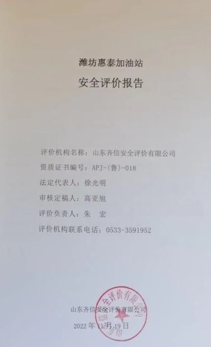 潍坊惠泰加油站位于峡山生态经济开发区潍峡路以东、岞山村以西、胶济铁路以南。该站成立于2020年01月15日,取得潍坊峡山生态经济开发区市场监督管理局颁发的营业执照。该加油站主要从事汽油和柴油的经营,经营方式为零售,法定代表人为刘增晓。类型为个人独资企业。该加油站由潍坊惠泰新能源科技有限公司投资建设。 潍坊惠泰新能源科技有限公司成立于2018年01月19日,注册地位于山东省潍坊市综合保税区高新二路东管委会办公楼408室(集群注册),法定代表人为刘增嵩。经营范围包括新能源技术研发;销售:太阳能电池、发电设备、建筑材料、装饰材料、阀门管件、五金产品、机电设备、办公用品、化工产品(不含危险化学品及易制毒化学品,不得存储)、机械设备、塑料制品、橡胶制品、电线电缆、家用电器、工艺品、陶瓷制品、卫生洁具、家具、饰品(以上不含危险化学品及易制毒化学品)。(依法须经批准的项目,经相关部门批准后方可开展经营活动)。 该加油站现有汽油双层罐2台,单罐容积30m3,柴油双层罐1台,单罐容积为30m3,柴油折半计入,该加油站油罐总容积为90m3,根据《汽车加油加气加氢站技术标准》(GB50156-2021)第3.0.9条之规定,为三级加油站。 该加油站于2020年4月26日取得了危险化学品经营许可证(证书编号:鲁潍危化经[2019]017006号),有效期至2022年12月22日;于2020年5月19日取得了成品油零售经营许可证(证书编号:鲁油零售证书第3707065001号),有效期至2025年5月19日。 该加油站现有职工6人,安全管理人员1人,站长和安全员已通过安全生产知识和管理能力考核合格,并取证。 依据《中华人民共和国安全生产法》(中华人民共和国主席令[2002]第70号,根据2021年6月10日中华人民共和国第十三届全国人民代表大会常务委员会第二十九次会议《全国人民代表大会常务委员会关于修改〈中华人民共和国安全生产法〉的决定》修正)、《危险化学品安全管理条例》(国务院令第591号,根据国务院令第645号修订)、《危险化学品经营许可证管理办法》(国家安全生产监督管理总局令第55号,根据安监总局令第79号修订)的要求,危险化学品经营许可证换发需进行安全评价,因此,潍坊惠泰加油站委托山东古天乐太阳集团城入口安全评价有限公司进行经营危险化学品安全评价。 接受委托后,山东古天乐太阳集团城入口安全评价有限公司成立评价组,在进行资料与标准收集、现场调研、项目资料分析、危险与有害因素分析的基础上,依据《安全评价通则》(AQ8001-2007)、《山东省加油站安全评价导则》(鲁安监发〔2006〕114号),通过对该加油站安全管理、站址选择及总平面布置、加油工艺及设施、其他设施等方面的审查,选择相应的评价方法对其危险、有害因素进行辨识和评价,编写完成了《潍坊惠泰加油站安全评价报告》。  |