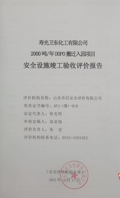 寿光卫东化工有限公司始建于1956年,是一家集科研、生产、加工、销售于一体的大型综合性化工企业。公司地处莱州湾畔、寿光北部,环抱海滨重镇——羊口镇,占地面积20km2,注册资本5000万元,拥有员工1500余人,下辖十三部一室,四个化工基地,五个制盐工区。属省级高新技术企业,为国内的阻燃剂开发生产基地、中国海洋化工产业基地和国家卤水资源综合利用示范基地。 因“退城入园”的要求,寿光卫东化工有限公司现将2000t/aDOPO阻燃剂项目搬入化工园区内,位于寿光市羊口化工产业园,汉江路以东,黄海东路以南,为新建厂区(寿光卫东化工有限公司化工二厂)。产品DOPO、OPP生产规模没变,主要生产工艺没变,副产品盐酸提高了回收技术,产量由2702.4吨提高为3290吨。 该项目于2020年5月由山东瑞康安全评价有限公司编制了安全预评价报告,于2020年10月由山东科达化工工程有限公司编制了安全设施设计专篇并出具了施工图,工程施工安装由山东四方安装工程有限公司负责,监理由青岛华鹏工程咨询集团有限公司承担,项目建设完成后由设计单位、施工单位、监理单位、建设单位四方签署了建设工程交工验收报告,并由东营开元安全评价有限责任公司编制了试生产条件安全评价报告,目前处于试生产阶段。 根据《危险化学品目录(2015版)》,该项目中间产品OPP(邻苯基苯酚)、副产品盐酸属于危险化学品,因此该项目属于新建危险化学品生产项目。根据《中华人民共和国安全生产法》、《危险化学品安全管理条例》、《山东省安全生产条例》、《危险化学品建设项目安全监督管理办法》等法律法规要求,该项目建设完成后应进行安全设施竣工验收评价。 受寿光卫东化工有限公司委托,山东古天乐太阳集团城入口安全评价有限公司承担了该公司2000吨/年DOPO搬迁入园项目的安全设施竣工验收评价。双方签定《安全评价技术服务合同》后,山东古天乐太阳集团城入口安全评价有限公司确定项目负责人,成立评价项目组,根据国家有关安全生产法律法规、行政规章及标准规范要求,通过对企业提供的资料进行分析和现场检查,结合其生产的实际情况,运用科学的评价方法进行定性、定量分析,提出合理、可行的安全对策措施及建议,并按照《安全验收评价导则》(AQ8003-2007)、《危险化学品建设项目安全评价细则(试行)》(安监总危化[2007]255号)和有关法规、技术标准、文件的规定与要求编制完成了本评价报告。寿光卫东化工有限公司应对提供资料的真实性负全部责任。  |