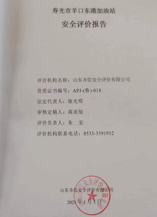寿光市羊口东港加油站成立于2005年01月11日,注册地位于寿光市羊口镇进港路一号羊临路东侧,投资人为张治国。经营范围包括零售:汽油、柴油(有效期限以许可证为准)(依法须经批准的项目,经相关部门批准后方可开展经营活动)。 该加油站现有埋地油罐3个,储罐均为双层储罐,具体为单罐容积10m3的埋地汽油罐2台,单罐容积30m3的埋地柴油罐1台,柴油折半计入,该加油站油罐总容积为35m3,根据《汽车加油加气加氢站技术标准》(GB50156-2021)第3.0.9条之规定,为三级加油站。 该加油站于2020年3月24日换发了危险化学品经营许可证(证书编号:鲁潍危化[2019] 005201号),有效期至2023年3月24日;于2021年01月18日换发了成品油零售经营许可证(证书编号:鲁油零售证书第3707123062),有效期至2026年01月18日。 该加油站现有职工5人,其中站长1人,安全员1人,站长和安全员已通过安全生产知识和管理能力考核合格,并取证。 依据《中华人民共和国安全生产法》(中华人民共和国主席令[2002]第70号,根据2021年6月10日中华人民共和国第十三届全国人民代表大会常务委员会第二十九次会议《全国人民代表大会常务委员会关于修改〈中华人民共和国安全生产法〉的决定》修正)、《危险化学品安全管理条例》(国务院令第591号,根据国务院令第645号修订)、《危险化学品经营许可证管理办法》(国家安全生产监督管理总局令第55号,根据安监总局令第79号修订)的要求,危险化学品经营许可证换发需进行安全评价,因此,寿光市羊口东港加油站委托山东古天乐太阳集团城入口安全评价有限公司进行经营危险化学品安全评价。 接受委托后,山东古天乐太阳集团城入口安全评价有限公司成立评价组,在进行资料与标准收集、现场调研、项目资料分析、危险与有害因素分析的基础上,依据《安全评价通则》(AQ8001-2007)、《山东省加油站安全评价导则》(鲁安监发〔2006〕114号),通过对该加油站安全管理、站址选择及总平面布置、加油工艺及设施、其他设施等方面的审查,选择相应的评价方法对其危险、有害因素进行辨识和评价,编写完成了《寿光市羊口东港加油站安全评价报告》。  |
