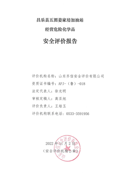 昌乐县五图姜家坊加油站位于山东省潍坊市昌乐县首阳山旅游度假区姜家坊子村12号,该站成立于2007年12月26日,2021年4月14日取得昌乐县行政审批服务局核发的新营业执照,投资人为魏猛。该加油站主要从事汽油和柴油的经营,经营方式为零售。 该站于 2021年7月23日取得《成品油零售经营批准证书》,有效期为2021年7月23日至2026年7月23日(证书编号:鲁油零售证书第3707053061号)。该站持有的《危险化学品经营许可证》(证书编号:鲁潍危化经[2019]011012号),有效期自2019年11月21日至2022年11月21日。该加油站在营业期间未发生安全事故。 昌乐县五图姜家坊加油站位于山东省潍坊市昌乐县首阳山旅游度假区姜家坊子村12号。该加油站主要经营的危险化学品为汽油,共有加油机5台,其中单枪汽油加油机3台,单枪柴油加油机2台,(加油机呈南、北两排布置,北侧一排均为92#加油机,南侧一排自西向东依次为-10#、95#、0#),汽油主要经营92#、95#,柴油冬季经营-10#,其它季节经营0#。无自助加油机。该站设有埋地卧式内钢外玻璃纤维增强塑料双层储罐4台,其中20m3汽油储罐2台,20m3柴油储罐2台(油罐自西向东依次为0#、-10#、92#、95#)。柴油折半后计入加油站储罐总容积为60m3,该站为三级加油站。油罐区日常汽油的最大存储量为31.6t,未构成重大危险源。  |