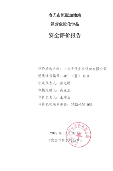 寿光市恒源加油站位于山东省潍坊市寿光市双王城生态经济园区牛头镇村村南,该站成立于2009年02月25日,2019年9月3日取得寿光市行政审批服务局核发的新营业执照,投资人为赵国根。该加油站主要从事汽油和柴油的经营,经营方式为零售。 该站于2020年04月16日取得《成品油零售经营批准证书》,有效期为2020年04月16日至2025年04月16日(证书编号:鲁油零售证书第3707123031号)。该站持有的《危险化学品经营许可证》(证书编号:鲁潍危化经[2019]005144号),有效期自2019年11月21日至2022年11月20日。该加油站在营业期间未发生安全事故。 寿光市恒源加油站位于山东省潍坊市寿光市双王城生态经济园区牛头镇村村南。该加油站主要经营的危险化学品为汽油,共有单枪加油机4台,2台单枪柴油加油机,2台单枪汽油加油机(加油机呈南北两排布置,北侧一排自东向西依次为92#、95#,南侧一排均为0#),汽油主要经营92#、95#,柴油冬季经营-10#,其它季节经营0#。无自助加油机。该站设有埋地卧式内钢外玻璃纤维增强塑料双层储罐4台,其中汽油储罐2台,容积均为10m3,柴油储罐2台,容积均为10m3,柴油折半后计入加油站储罐总容积为30m3,该站为三级加油站。油罐区日常汽油的最大存储量为15.8t,未构成重大危险源。  |