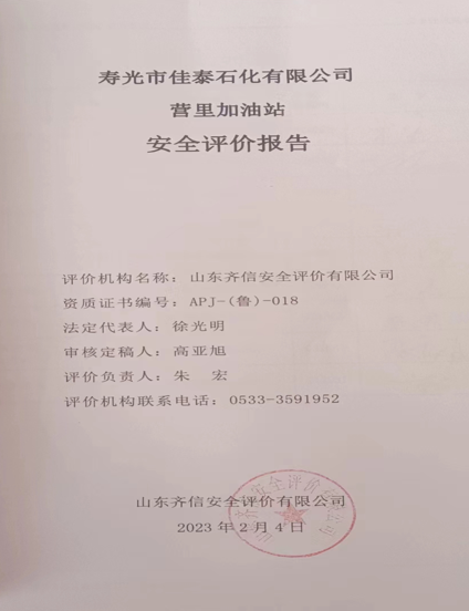 寿光市佳泰石化有限公司营里加油站位于寿光市营里镇辛沙路与羊临路交叉口西南角,负责人为张文栋,类型为有限责任公司分公司。该站成立于2022年12月7日,取得寿光市行政审批服务局颁发的营业执照。该加油站原名为中国石化销售有限公司山东潍坊寿光第五加油站,于2022年12月1日换发了危险化学品经营许可证(鲁潍危化经[2022]005185号)。寿光市佳泰石化有限公司营里加油站与中国石化销售有限公司山东潍坊寿光第五加油站签订了租赁经营合同,主要从事汽油和柴油的经营,经营方式为零售。 该加油站现有埋地油罐4个,储罐均为埋地双层SF卧式储罐,单罐容积均为30m3,其中汽油罐2个,柴油罐2个,柴油折半计入,该加油站油罐总容积为90m3,根据《汽车加油加气加氢站技术标准》(GB50156-2021)第3.0.9条之规定,为三级加油站。 该加油站现有职工7人,其中站长1人,安全员1人,主要负责人、安全员已通过安全生产知识和管理能力考核合格,并取证。 依据《中华人民共和国安全生产法》(中华人民共和国主席令[2002]第70号,根据2021年6月10日中华人民共和国第十三届全国人民代表大会常务委员会第二十九次会议《全国人民代表大会常务委员会关于修改〈中华人民共和国安全生产法〉的决定》修正)、《危险化学品安全管理条例》(国务院令第591号,根据国务院令第645号修订)、《危险化学品经营许可证管理办法》(国家安全生产监督管理总局令第55号,根据安监总局令第79号修订)的要求,危险化学品经营许可证换发需进行安全评价,因此,寿光市佳泰石化有限公司营里加油站委托山东古天乐太阳集团城入口安全评价有限公司进行经营危险化学品安全评价。 接受委托后,山东古天乐太阳集团城入口安全评价有限公司成立评价组,在进行资料与标准收集、现场调研、项目资料分析、危险与有害因素分析的基础上,依据《安全评价通则》(AQ8001-2007)、《山东省加油站安全评价导则》(鲁安监发〔2006〕114号),通过对该加油站安全管理、站址选择及总平面布置、加油工艺及设施、其他设施等方面的审查,选择相应的评价方法对其危险、有害因素进行辨识和评价,编写完成了《寿光市佳泰石化有限公司营里加油站安全评价报告》。  |