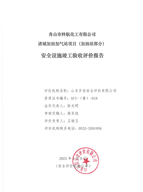 舟山市梓航化工有限公司诸城加油站成立于2023年1月4日,2023年1月4日取得诸城市行政审批服务局核发的营业执照,类型为其他有限责任公司分公司,负责人林松峰,经营场所为山东省潍坊市诸城市舜王街道舜王大道(G206)与青兰高速交叉口东北角。 该项目于2021年9月29日取得了潍坊市商务局出具的《关于舟山市梓航化工有限公司诸城加油站等企业申请成品油零售网店规划确认的批复》(潍商务字[2021]70号),同意舟山市梓航化工有限公司诸城加油站新建网点规划。 该站主要经营汽油、柴油等成品油,经营方式为零售。舟山市梓航化工有限公司诸城加油加气站项目总投资3000万元,加油站项目投资2000万元,其中安全设施投入约30万元。加油站部分建设内容包括罩棚、站房、加油机、埋地储油罐及其配套设施。 该项目(加油站部分)于2022年9月15日开工建设,2022年12月25日竣工。按照《中华人民共和国安全生产法》、《危险化学品建设项目安全监督管理办法》等法律、法规、文件的规定要求,该加油站委托我公司对其加油站建设项目进行安全设施竣工验收评价工作。 舟山市梓航化工有限公司诸城加油加气站项目占地面积约3385m2,其中站房建筑面积300m2,加油机罩棚占地面积800m2。该站包括1座营业站房,为二层建筑,由办公室、营业室、配电室、值班室、无明火厨房、卫生间等构成。设加油机4台(六枪汽油加油机2台,四枪柴油加油机2台),加油枪共20支,设埋地承重罐区1处(30m3埋地汽油罐2台,30m3埋地柴油罐3台),加油站储罐总容积为105m3(柴油折半计),该加油站采用潜油泵加油工艺。  |
