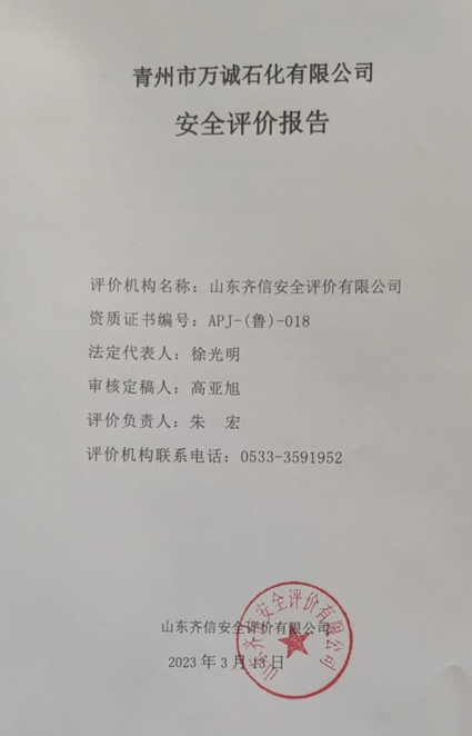 青州市万诚石化有限公司成立于2022年8月31日,地址位于青州市弥河镇郝家村西侧,公司于2022年9月28日取得危险化学品经营许可证(证号:鲁潍危化经[2022]007100号,有效期2022年9月28日至2025年9月27日),于2022年10月24日取得成品油零售许可证(证号:鲁油零售证书第3707113017号,有效期2022年10月24日至2027年10月24日)。  该公司共有职工5人,其中安全管理人员1人,经营油品为汽油和柴油。该公司现有汽油双层罐2个,单罐容积30m3,柴油双层罐2个,单罐容积为30m3,柴油折半计入,该加油站油罐总容积为90m3,为三级加油站。 该加油站原有双枪加油机6台,单枪加油机4台(停用),加油站根据经营需要,准备启用原停用的4台加油机,并且在站内站房南侧增加洗车房,加油站设备设施产生变化,依据《中华人民共和国安全生产法》(中华人民共和国主席令第13号,中华人民共和国主席令第88号修正)、《危险化学品安全管理条例》(中华人民共和国国务院令第645号)、《危险化学品经营许可证管理办法》(国家安全生产监督管理总局令 第55号   根据安监总局令第79号修订)的要求,需进行安全评价,因此,青州市万诚石化有限公司委托山东古天乐太阳集团城入口安全评价有限公司进行经营危险化学品安全评价。 接受委托后,山东古天乐太阳集团城入口安全评价有限公司成立评价组,在进行资料与标准收集、现场调研、项目资料分析、危险与有害因素分析的基础上,依据《安全评价通则》(AQ8001-2007)、《山东省加油站安全评价导则》(鲁安监发〔2006〕114号),通过对该加油站安全管理、站址选择及总平面布置、加油工艺及设施、其他设施等方面的审查,选择相应的评价方法对其危险、有害因素进行辨识和评价,编写完成了《青州市万诚石化有限公司安全评价报告》。                 |