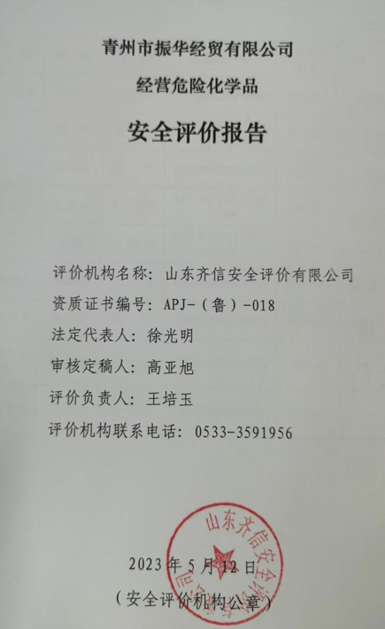 青州市振华经贸有限公司,位于山东省潍坊市青州市经济开发区益都东路2888号,成立日期为2021年12月7日,注册资本捌佰万元整,法定代表人刘鹏程,类型为有限责任公司(自然人投资或控股)。经营范围:一般项目:化工产品销售(不含许可类化工产品);专用化学产品销售(不含危险化学品)。(除依法须经批准的项目外,凭营业执照依法自主开展经营活动)。 山东振华工业股份有限公司,位于青州市益都东路2888号,成立日期为2000年9月22日,注册资本贰仟壹佰伍拾捌万元整,法定代表人孙广宝,类型为股份有限公司(非上市、自然人投资或控股)。经营范围:磷酸、食品添加剂磷酸生产、销售(有效期限以许可证为准)。二氧化硫脲、硫酸钡、磷酸盐生产、销售(国家限制类、淘汰类项目及危险品不得生产经营,需许可证的凭许可证且经环保部门验收合格后生产经营),经营本企业自产产品及技术的出口业务和本企业所需的机械设备、零配件、原辅材料及技术的进口业务。(除依法须经批准的项目外,凭营业执照依法自主开展经营活动)。山东振华工业股份有限公司原有磷酸生产装置现已停用,物料已清空,管道已断开,待拆除。山东振华工业股份有限公司不再进行磷酸生产,只进行磷酸储存经营,取得了《危险化学品经营许可证》。因业务调整,山东振华工业股份有限公司将产权转让给青州市振华经贸有限公司。 该公司磷酸仓库内设有1个容积为34m3磷酸储罐,2个容积为8.5m3磷酸储罐,危险化学品的运输由有危险货物运输资质的单位承运。该公司现有职工17人,其中技术管理人员1人,专职安全生产管理人员1人。该公司主要负责人刘鹏程、安全生产管理人员杨晓艳,于2023年1月10日任职,主要负责人和安全生产管理人员取得了安全生产知识和管理能力考核合格证。安全生产知识和管理能力考核合格证见附件。其他从业人员经本单位培训考核合格。  |