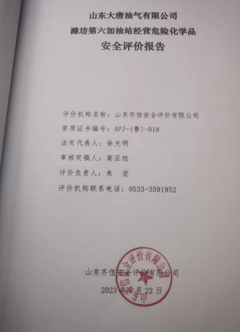 山东大唐油气有限公司潍坊第六加油站位于昌乐县营丘镇茁山子村东北206国道东侧,法定代表人为陈世超,类型为有限责任公司分公司,站经理刘文朋。该加油站成立于2008年10月28日,取得昌乐县行政审批服务局颁发的营业执照。经营范围:汽油、柴油零售;零售预包装食品,乳制品(不含婴幼儿配方乳粉),保健食品,在本店内零售卷烟、雪茄烟(有效期限以许可证为准),销售陶瓷制品,工艺品,汽车用品,轮胎,燃油添加剂(不含危险品),化肥;汽车美容,装饰(不含维修);房屋租赁、发布广告,润滑油零售;日用百货便利店经营(依法须经批准的项目,经相关部门批准后方可开展经营活动)。 该加油站已取得成品油零售经营批准证书,证书编号:鲁油零售证书第3707053047号,证书有效期为2021年10月19日至2026年10月19日。2020年5月11日取得了危险化学品经营许可证,证书编号:鲁潍危化经[2020]011014号,有效期为2020年6月2日至2023年6月1日。该加油站经营期间未发生安全事故。 该加油站现有埋地油罐4个,储罐均为埋地双层SF卧式储罐,单罐容积均为30m3,其中汽油罐2个,柴油罐2个,柴油折半计入,该加油站油罐总容积为90m3,根据《汽车加油加气加氢站技术标准》(GB50156-2021)第3.0.9条之规定,为三级加油站。 该加油站现有职工7人,其中其中安全管理人员1人,技术管理人员1人,主要负责人、站经理、安全员已通过安全生产知识和管理能力考核合格,并取证,其他从业人员经本单位培训考核合格。 依据《中华人民共和国安全生产法》(中华人民共和国主席令[2002]第70号,根据2021年6月10日中华人民共和国第十三届全国人民代表大会常务委员会第二十九次会议《全国人民代表大会常务委员会关于修改〈中华人民共和国安全生产法〉的决定》修正)、《危险化学品安全管理条例》(国务院令第591号,根据国务院令第645号修订)、《危险化学品经营许可证管理办法》(国家安全生产监督管理总局令第55号,根据安监总局令第79号修订)的要求,危险化学品经营许可证换发需进行安全评价,因此,山东大唐油气有限公司潍坊第六加油站委托山东古天乐太阳集团城入口安全评价有限公司进行经营危险化学品安全评价。 接受委托后,山东古天乐太阳集团城入口安全评价有限公司成立评价组,在进行资料与标准收集、现场调研、项目资料分析、危险与有害因素分析的基础上,依据《安全评价通则》(AQ8001-2007)、《山东省加油站安全评价导则》(鲁安监发〔2006〕114号),通过对该加油站安全管理、站址选择及总平面布置、加油工艺及设施、其他设施等方面的审查,选择相应的评价方法对其危险、有害因素进行辨识和评价,编写完成了《山东大唐油气有限公司潍坊第六加油站安全评价报告》。  |