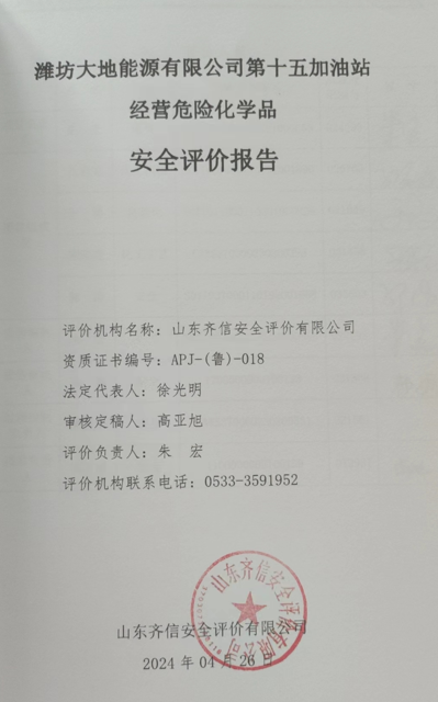 潍坊大地能源有限公司第十五加油站位于山东省潍坊市潍城区安顺路50号,该站成立于2014年12月04日,取得潍坊市潍城区市场监督管理局颁发的营业执照。法定负责人为何姗娜,主要负责人何姗娜。该加油站主要从事汽油和柴油的经营,经营方式为零售。 该站于2020年01月21日换取了《成品油零售经营批准证书》(证书编号:鲁油零售证书第3707161011号),有效期自2020年01月21日至2025年01月21日。该站持有的《危险化学品经营许可证》(证书编号:鲁潍危化经[2022]002022号),有效期自2022年08月20日至2025年08月19日。该加油站在营业期间未发生安全事故。 该加油站现有埋地油罐4个,储罐均为埋地双层SF卧式储罐,单罐容积均为30m3,汽油罐3个,柴油罐1个,柴油折半计入,该加油站油罐总容积为105m3,根据《汽车加油加气加氢站技术标准》(GB50156-2021)第3.0.9条之规定,为二级加油站。 根据《中华人民共和国安全生产法》(中华人民共和国主席令〔2002〕第70号,经主席令〔2009〕第18号修订,经主席令〔2014〕第13号修订,经主席令〔2021〕第88号修订)、《危险化学品安全管理条例》(中华人民共和国国务院令〔2002〕第344号,经国务院令〔2011〕第591号修订,经国务院令〔2013〕第645号修订)、《危险化学品建设项目安全监督管理办法》(国家安全生产监督管理总局令[2012]第45号,[2015]年第79号修改)、《关于开展化工装置设计安全诊断工作的意见》(鲁安监发[2011]118号)、《关于加快推进化工装置设计安全诊断工作的通知》(鲁安监发[2012]146号)、《山东省安全生产条例》(山东省人民代表大会常务委员会公告〔2017〕第168号,〔2021〕第185号修订)等的要求,全省所有未经正规设计(没有设计或者设计内容不全;设计单位不具备相应资质;虽有设计但企业擅自改造后与原设计有较大出入,相关工艺安全要求发生重大变化;仅有安全设施设计专篇、没有项目的施工图设计)的化工生产装置和储存设施,必须由具备相应资质的设计单位进行设计安全诊断,查找存在的安全隐患,出具安全诊断报告书;进行经营危险化学品安全现状评价。本加油站已经山东鸿运工程设计有限公司出具设计安全诊断报告;我公司受委托进行安全现状评价。 接受委托后,我公司立即成立评价组,在进行资料与标准收集、现场调研、项目资料分析、危险与有害因素分析的基础上,依据《山东省加油站安全评价导则》(鲁安监发[2006]114号),在经营单位的通力合作下,对加油站进行了评价并编写完成了《潍坊大地能源有限公司第十五加油站经营危险化学品安全评价报告》。 |