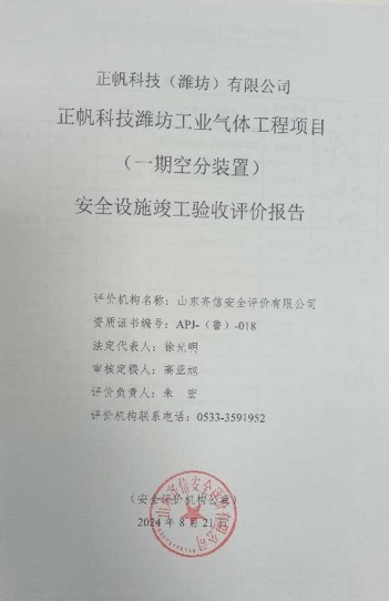正帆科技(潍坊)有限公司成立于2021年06月03日,企业类型为有限责任公司(港澳台投资、非独资),注册地位于潍坊滨海经济技术开发区大家洼街道黄海路以西、规划支路以南,法定代表人为史可成,注册资本2000万美元,经营范围包括一般项目:工程和技术研究和试验发展;基础化学原料制造(不含危险化学品等许可类化学品的制造);特种设备出租;机械设备租赁;陆地管道运输;气体、液体分离及纯净设备销售;电子专用材料制造;电子专用材料销售;仪器仪表销售;半导体器件专用设备销售;机械电气设备销售;光伏设备及元器件销售;电子产品销售;技术服务、技术开发、技术咨询、技术交流、技术转让、技术推广。(除依法须经批准的项目外,凭营业执照依法自主开展经营活动)许可项目:道路货物运输(含危险货物);水路危险货物运输;移动式压力容器/气瓶充装;药品批发;药品零售。(依法须经批准的项目,经相关部门批准后方可开展经营活动,具体经营项目以相关部门批准文件或许可证件为准)。 为增加公司的业务辐射范围,与公司现有产品产生协同效应,提高公司市场竞争优势,上海正帆科技股份有限公司计划由全资子公司上海徕风工业科技有限公司与香港正帆国际贸易有限公司共同出资新设全资孙公司正帆科技(潍坊)有限公司,在潍坊滨海经济技术开发区实施正帆科技潍坊工业气体工程项目。该项目于2021年11月11日取得了山东省建设项目备案证明,项目代码:2111-370700-04-01-532024。项目分二期建设,一期为生产氧氮氩的空气分离装置,二期工程为单氮空分及钢瓶充装生产线。 正帆科技(潍坊)有限公司正帆科技潍坊工业气体工程项目(一期空分装置)由山东应急安全技术服务有限公司进行了设立安全评价,于2022年5月28日取得潍坊市应急管理局出具的《危险化学品建设项目安全审查意见书》,编号:潍应急危化项目审字[2022]0042号;由中冶华天南京工程技术有限公司进行了安全设施设计,于2022年11月26日取得潍坊市应急管理局出具的《危险化学品建设项目安全审查意见书》,编号:潍应急危化项目审字[2022]0095号。项目施工单位为江苏禾桥建设集团有限公司,监理单位为上海宝钢工程咨询有限公司。该项目于2023年2月开工建设,于2023年12月建设完成。企业根据《山东省化工装置安全试车工作规范》(DB37/T1854-2020)编制了《正帆科技潍坊工业气体工程项目(一期空分装置)试生产方案》,于2024年3月组织专家对试生产方案进行了审查、对试生产条件进行了确认,对专家提出的意见进行了整改,于2024年4月由山东古天乐太阳集团城入口安全评价有限公司出具了试生产条件安全评价报告,于2024年5月6日进入试运行阶段,到目前为止,试运行期间达产达标,无安全生产事故发生。 该项目产品氧[压缩的]、氧[液化的]、氮[压缩的]、氮[液化的]、氩[液化的]均为列入《危险化学品目录》(2015版,2022年修订)的危险化学品,故该项目属于危险化学品生产建设项目。 根据《中华人民共和国安全生产法》、《危险化学品安全管理条例》、《山东省安全生产条例》、《危险化学品建设项目安全监督管理办法》等法律法规要求,该项目建设完成后应进行安全设施竣工验收评价。 受正帆科技(潍坊)有限公司委托,山东古天乐太阳集团城入口安全评价有限公司承担了该公司正帆科技潍坊工业气体工程项目(一期空分装置)的安全设施竣工验收评价。双方签订《安全评价技术服务合同》后,山东古天乐太阳集团城入口安全评价有限公司确定项目负责人,成立评价项目组,根据国家有关安全生产法律法规、行政规章及标准规范要求,通过对企业提供的资料进行分析和现场检查,结合其生产的实际情况,运用科学的评价方法进行定性、定量分析,提出合理、可行的安全对策措施及建议,并按照《安全验收评价导则》(AQ8003-2007)、《危险化学品建设项目安全评价细则(试行)》(安监总危化[2007]255号)和有关法规、技术标准、文件的规定与要求编制完成了本评价报告。 |