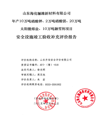 山东海化骊潍新材料有限公司 年产10万吨硝酸钾、2万吨硝酸镁、20万吨太阳能熔盐、10万吨融雪剂项目 安全设施竣工验收评价报告